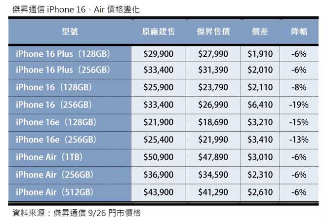 iPhone Air一開賣坊間就有通路率先降價,成為罕見的情況,以知名通訊商地標網通為例,全容量版本直接現折2010元,等於新機一上市就出現4%至5%的價格跳水。而且近期價格再度下探,根據傑昇通信最新報價,256GB從3萬6900元降至3萬4590元;512GB由4萬3900元下殺至4萬1290元;1TB自5萬900元下調為4萬7890元。